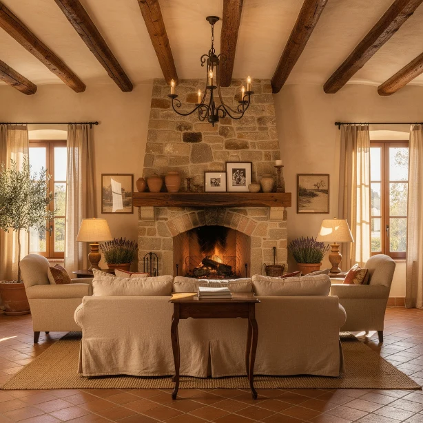 Inside, exposed beams and terracotta floors create warmth and authenticity. Natural light streams through small windows, highlighting earthy tones and handmade details. This style celebrates tradition, comfort, and the beauty of countryside living.