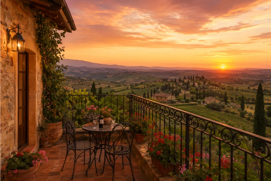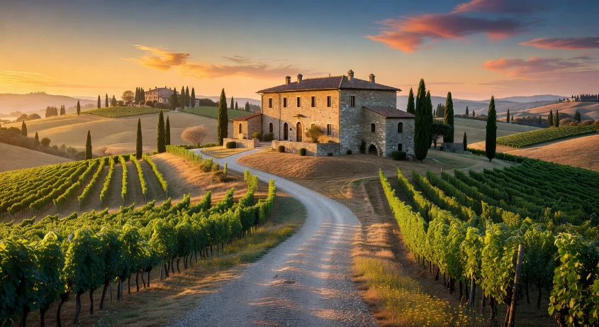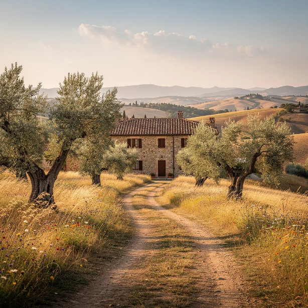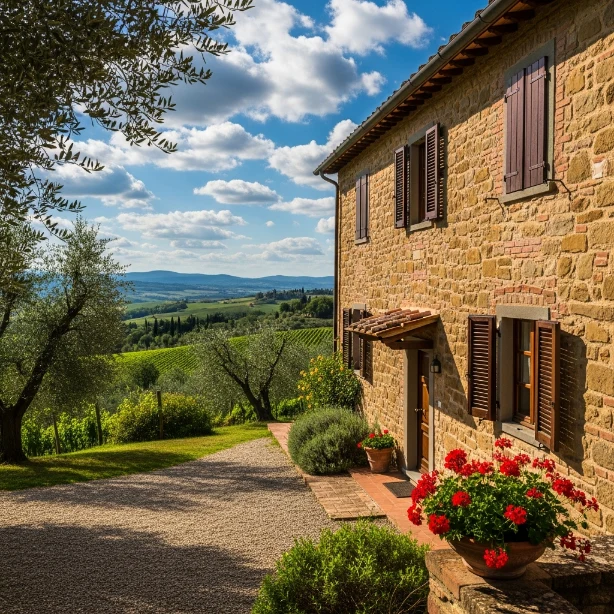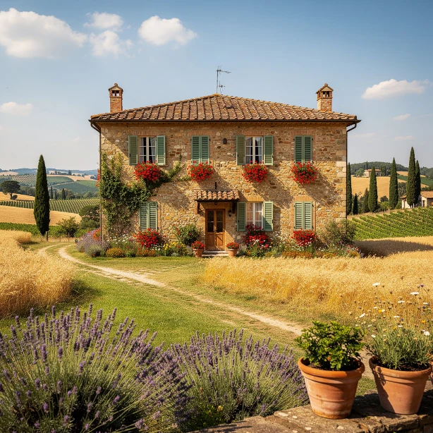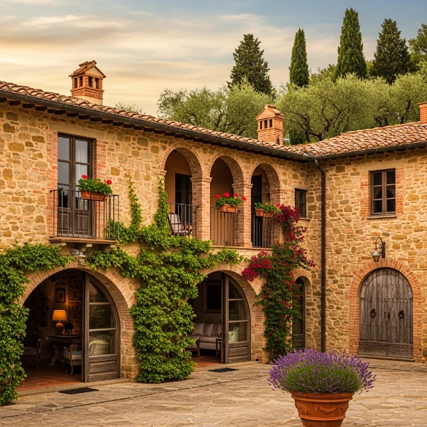 A rustic stone farmhouse captures the heart of Tuscany with weathered textures and timeless charm. Thick stone walls keep interiors cool during warm summers while adding historic character. Surrounded by rolling hills and olive groves, these homes feel deeply connected to the landscape.