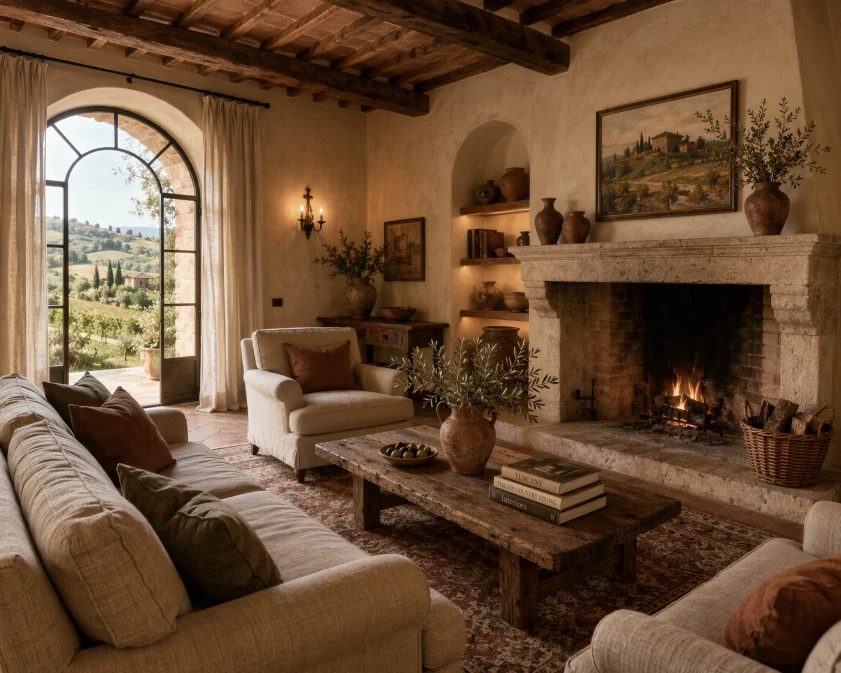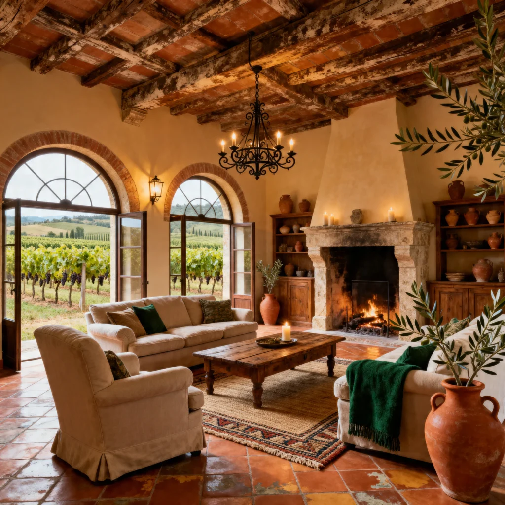 Terracotta floors bring warmth and texture to Tuscan interiors. Their earthy tones complement stone walls and wooden beams perfectly.