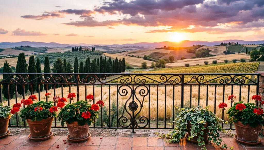 Balconies provide stunning countryside views. Iron railings add rustic elegance.