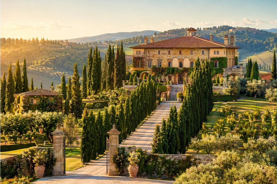 A long driveway lined with cypress trees creates an unforgettable entrance to a Tuscan villa. The symmetrical landscaping enhances the home’s grandeur while preserving rustic elegance. Warm stone façades glow beautifully under golden sunlight.