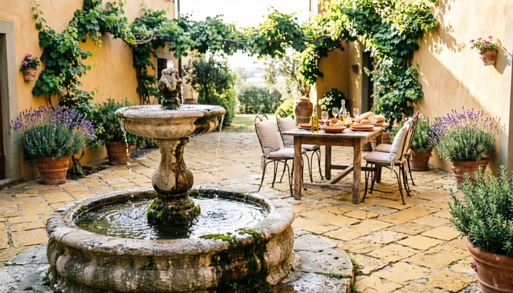 Courtyard living is central to Tuscan architecture. Private outdoor spaces with fountains and greenery provide perfect spots for dining and relaxation. The enclosed design feels intimate and welcoming.