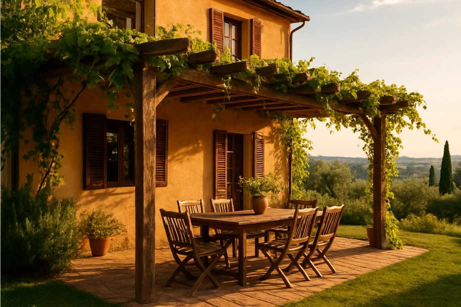 Pergolas create shaded outdoor living areas perfect for warm climates. Wooden beams draped with vines provide natural beauty and cooling shade.