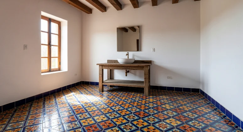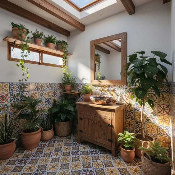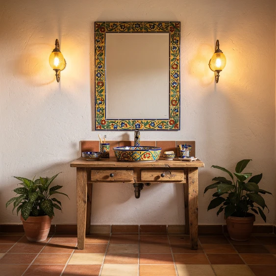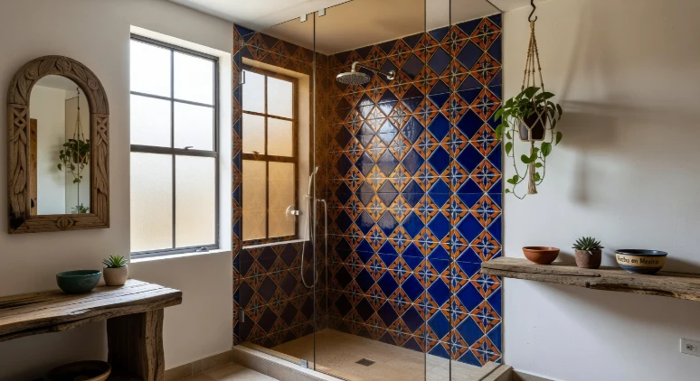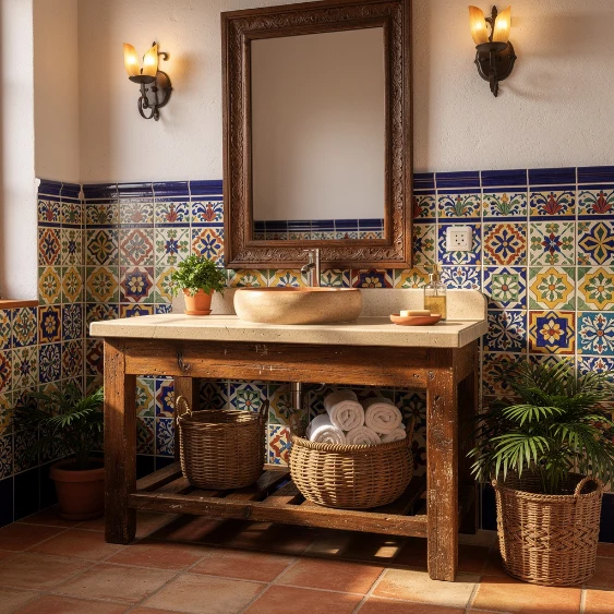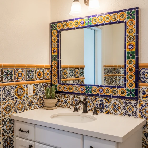 Talavera tiles instantly bring personality and cultural charm into a bathroom. Their colorful patterns create a stunning feature wall behind the vanity or shower. Pairing them with crisp white walls allows the intricate designs to stand out without overwhelming the space.
