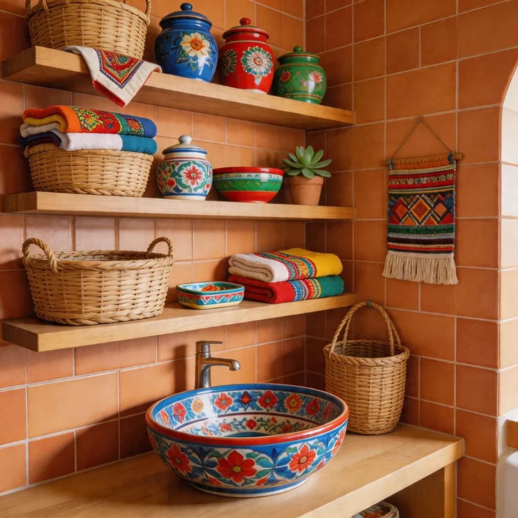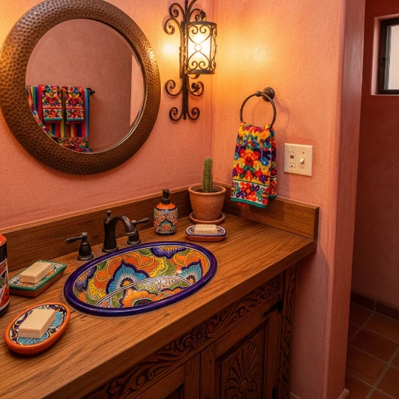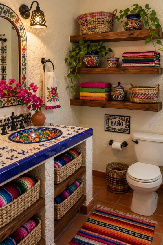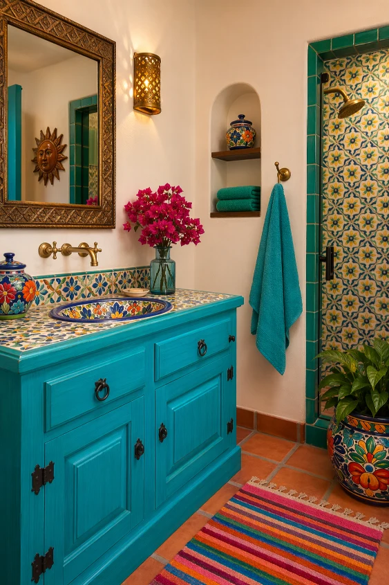 Balance patterns with simple fixtures and neutral walls. This final idea celebrates vibrant Mexican style beautifully.