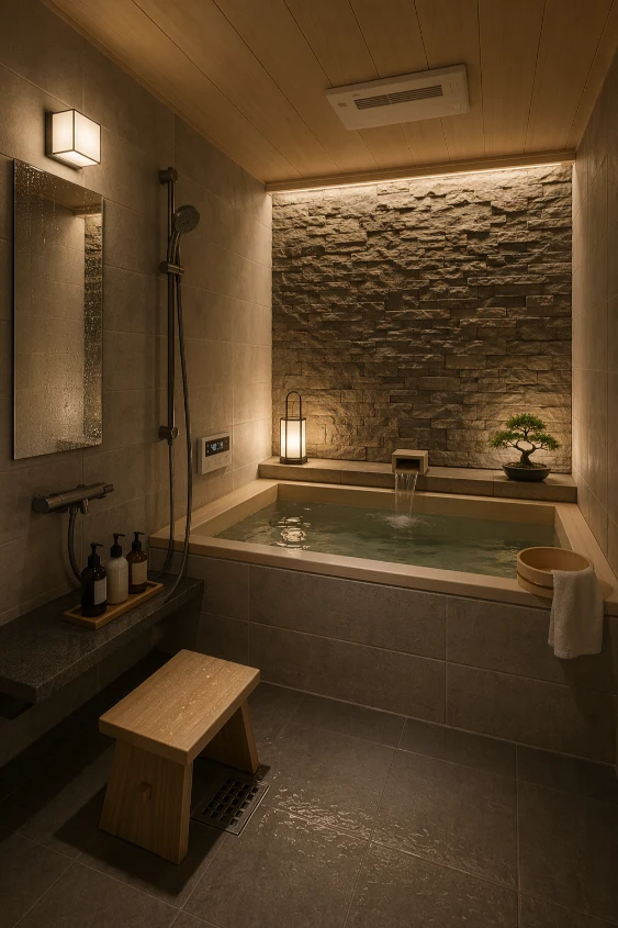Japanese bathrooms focus on simplicity and relaxation. Clean lines, neutral colors, and natural textures create a spa-like environment. A soaking tub becomes the focal point.