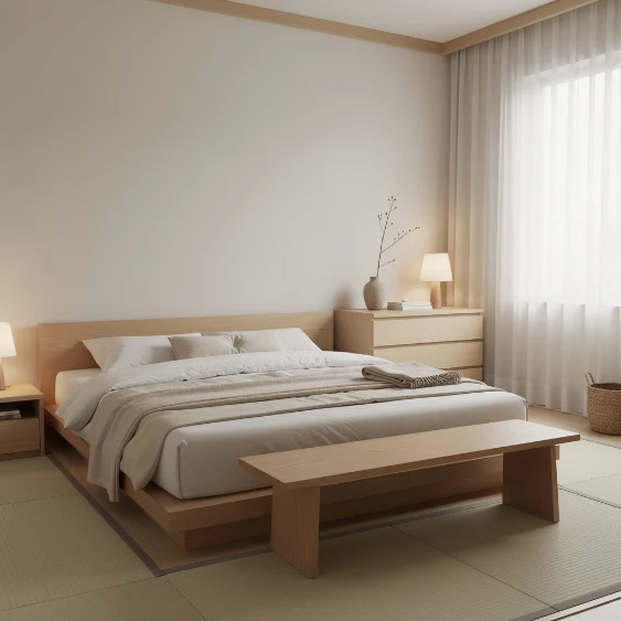 Low platform beds make bedrooms feel spacious and uncluttered. The reduced height creates an open visual flow and emphasizes simplicity. Neutral bedding enhances the calming atmosphere.