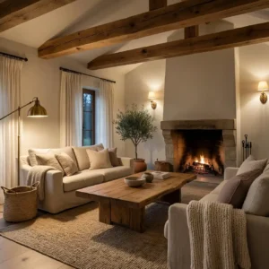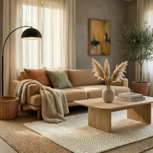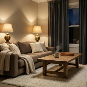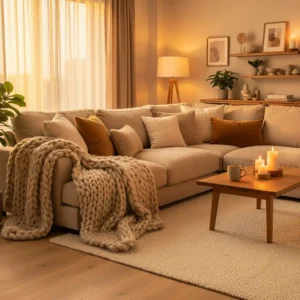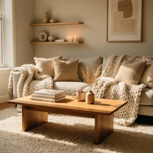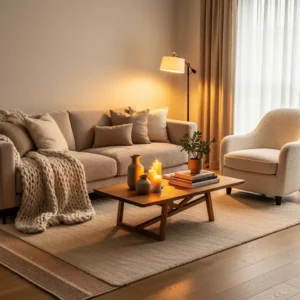Keep the furniture arrangement intimate and comfortable to encourage conversation and relaxation. Wooden accents and warm lighting enhance the cozy atmosphere even further. This layered approach transforms a simple living room into a comforting retreat that feels calm, soft, and inviting at any time of day.