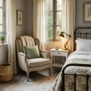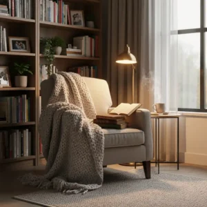 A reading nook adds a quiet corner of comfort to any living room. A soft armchair near a window, paired with a warm blanket and a small side table, creates the perfect spot to relax with a book. The simplicity of the setup keeps the space peaceful.