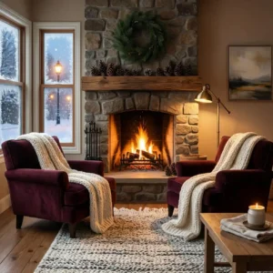 Nothing says cozy quite like a living room centered around a warm fireplace. The gentle glow of a fire creates a comforting focal point that naturally draws people together. Soft armchairs and layered textiles around the hearth make the space perfect for quiet evenings or relaxed gatherings.