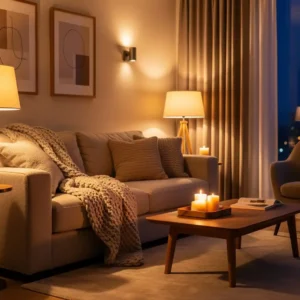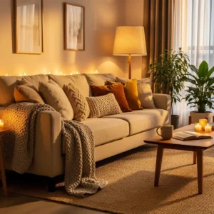 Lighting plays a huge role in creating a cozy living room. Instead of relying on bright overhead lights, use layered lighting from table lamps, floor lamps, and candles. These warm sources of light create gentle shadows that make the room feel intimate and inviting.