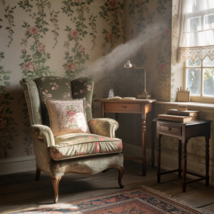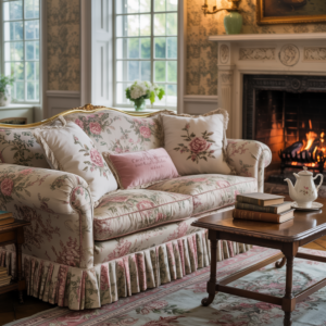 Layering is key to achieving this cozy aesthetic. Combine florals with striped or subtle plaid fabrics for depth and authenticity. A classic fireplace with a wooden mantel, topped with antique decor and fresh flowers, enhances the room’s warmth. This inviting setup encourages relaxation and conversation, making it perfect for Pinterest-worthy inspiration boards.