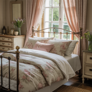 English country bedrooms focus on comfort and romantic detailing. A wrought iron or upholstered bed dressed in floral or toile bedding sets the tone for softness. Neutral walls in cream or pale sage provide a calming backdrop, allowing vintage furniture pieces to shine without overwhelming the space.