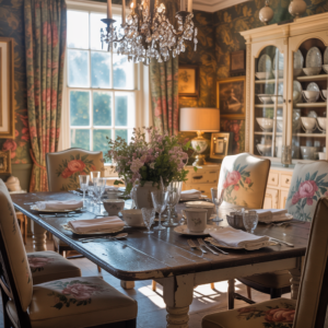 A traditional wooden dining table forms the heart of an English country dining room. Surround it with upholstered chairs in soft patterns to introduce comfort and subtle elegance. Patterned wallpaper, such as florals or damask, adds depth while maintaining a refined countryside charm.