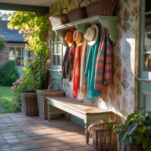 An English country entryway sets the tone for the entire home with warmth and charm. A simple wooden bench paired with wall-mounted coat hooks creates a practical yet stylish first impression. Floral wallpaper or soft painted walls enhance the welcoming countryside feel from the moment guests arrive.