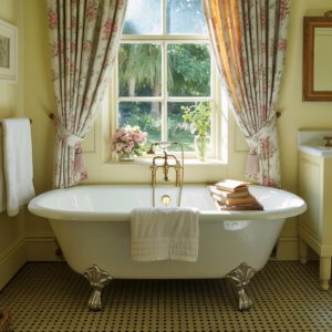 Soft pastel walls and floral curtains introduce warmth and subtle pattern. Incorporating woven baskets and antique mirrors adds texture and character. This style transforms everyday routines into soothing rituals, creating a bathroom that feels refined, comfortable, and beautifully connected to countryside tradition.