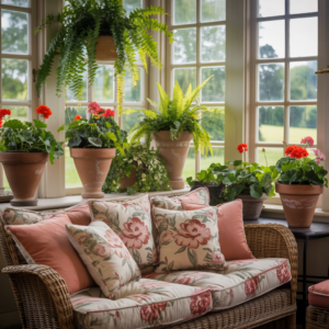 A sunroom filled with natural light perfectly captures the essence of English country living. Wicker or rattan furniture paired with floral cushions creates a relaxed and inviting atmosphere. Large windows frame garden views, seamlessly blending indoor comfort with outdoor beauty.