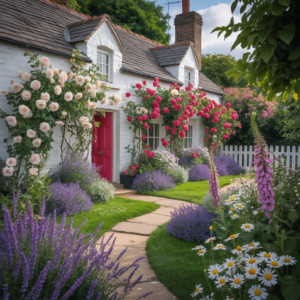Climbing roses along walls or fences enhance the home’s exterior beauty. Mixing structured hedges with slightly wild plantings creates that perfectly imperfect countryside look. This enchanting garden style extends the home’s warmth outdoors, offering a peaceful sanctuary that feels timeless and irresistibly beautiful.