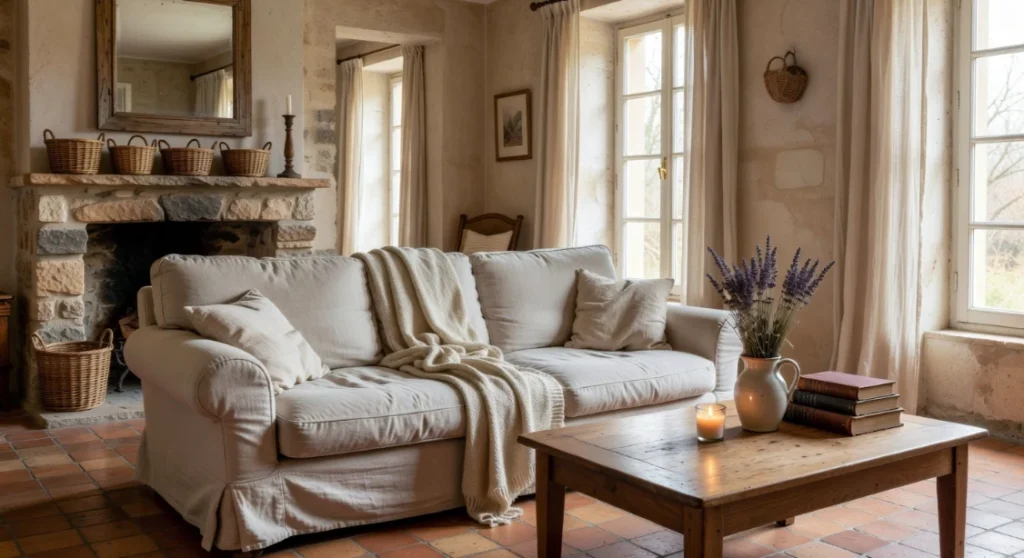 A linen slipcover sofa in a soft oatmeal, warm white, or pale grey tone is the cornerstone piece of any French cottage living room. The beauty of slipcovers lies in their relaxed, unfussy quality — they drape and gather in a way that feels lived-in and inviting rather than stiff or formal. Linen as a fabric ages gracefully, developing a gentle rumpled softness with each wash that only adds to its appeal. This is furniture that tells you to sit down, relax, and stay a while.