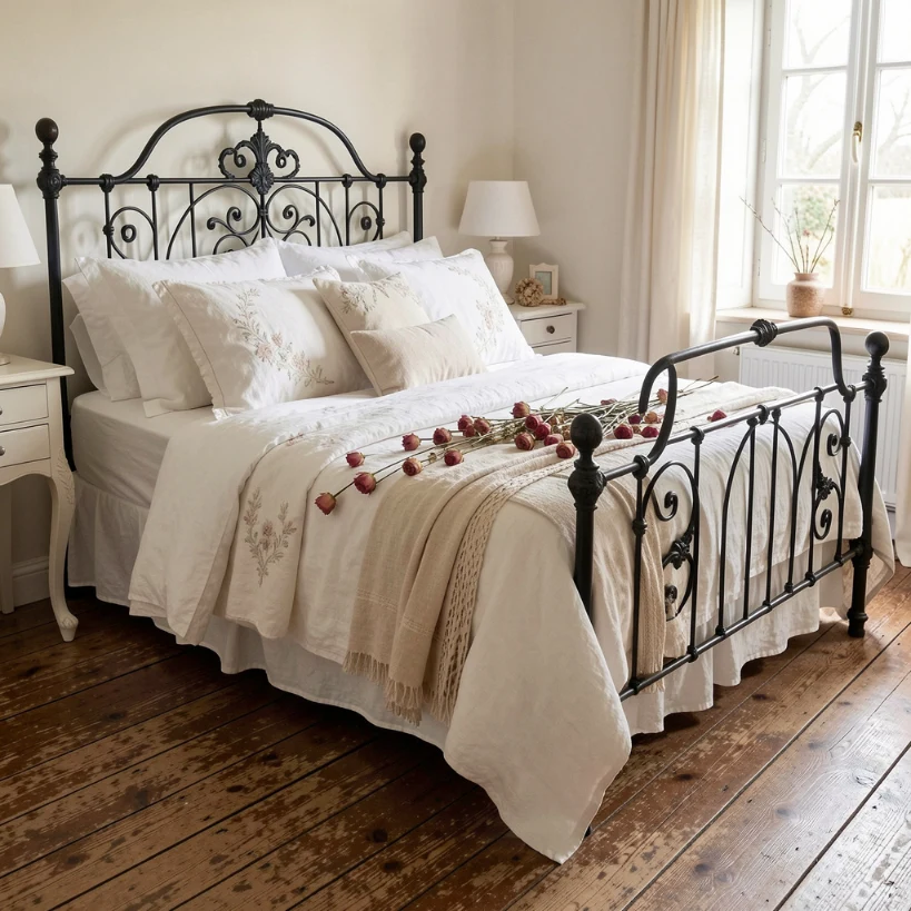 Dressing the iron bed with layers of white and cream linen — crisp cotton sheets beneath, a washed linen duvet cover above, embroidered pillowcases, and a loosely draped throw at the foot — creates a bed that looks as though it belongs in a Provence auberge. Dried rose petals scattered across the linen add a final touch of romantic excess that is entirely permissible in the French cottage bedroom. This bed style has a particular quality in morning light — the iron frame casting gentle shadows across the white linen — that makes it one of the most photographed and most-saved bedroom subjects on Pinterest’s romantic interior design boards.