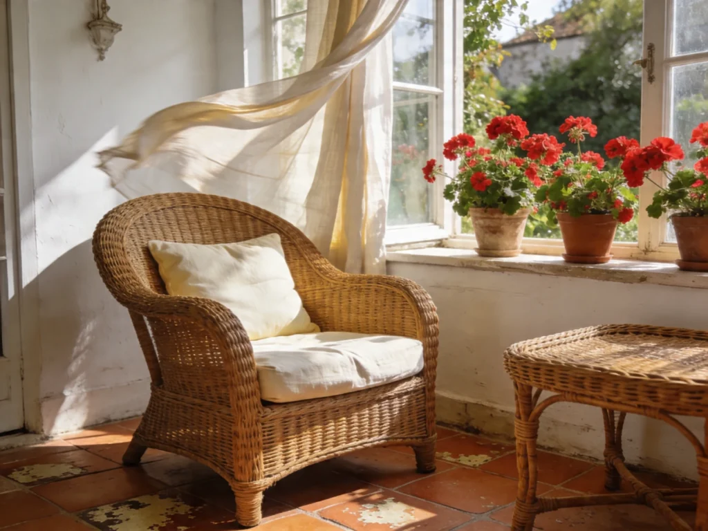 The appeal of wicker and rattan in the French cottage context is their honest, craft quality — you can see and understand exactly how they are made, which gives them a transparency and authenticity that manufactured furniture often lacks. In a sunroom or conservatory, rattan furniture surrounded by potted geraniums, trailing ivy, and linen curtains moving gently in the summer breeze creates a setting of almost cinematic French countryside beauty. Potted red and pink geraniums on the windowsill are a particularly French touch — ubiquitous on the window ledges of Provence and Brittany. This sunroom aesthetic is endlessly popular on Pinterest’s French cottage and interior lifestyle boards.