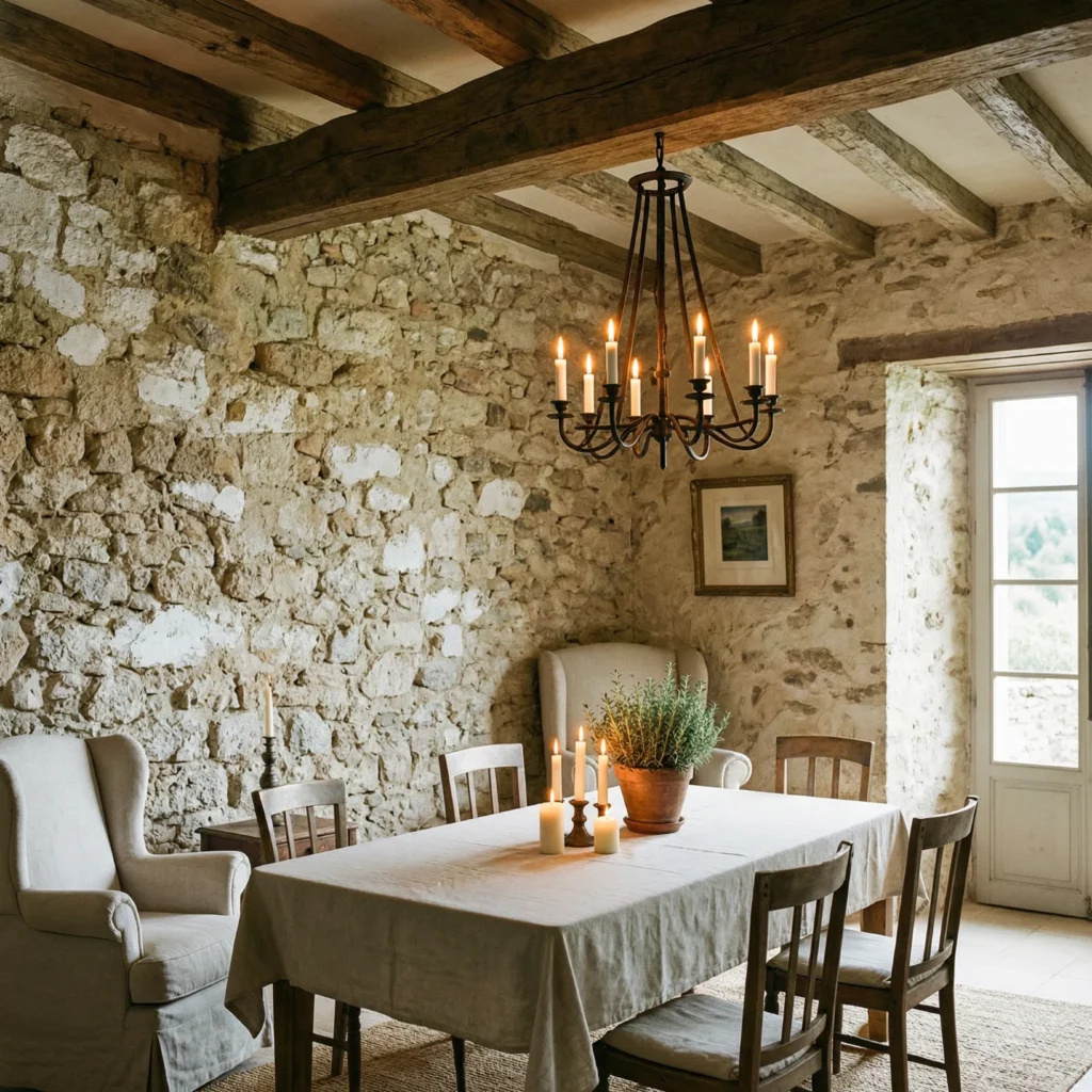 Lighting is perhaps the most transformative element in creating an authentic French cottage atmosphere, and nothing achieves the soft, romantic quality of genuine French country living as effectively as candlelight combined with a vintage chandelier. An aged iron or crystal chandelier hung low above a farmhouse dining table casts the kind of warm, gentle light that flatters faces, softens edges, and makes every meal feel like an occasion. In the French tradition, dining is a ceremony deserving of beautiful light.