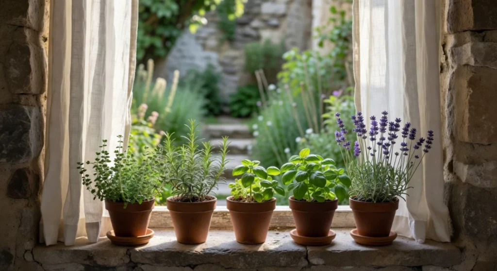 A windowsill herb garden inside the French cottage kitchen is a decorative gesture that is simultaneously practical, beautiful, and deeply rooted in the French culinary tradition. Small terracotta pots of thyme, rosemary, flat-leaf parsley, chives, and tarragon lined up along the kitchen window create a miniature living garden that brings scent, colour, and texture into the heart of the home. The herbs are there to be cooked with, and the act of snipping a few sprigs for a dish is one of the small daily pleasures that define French cottage life.