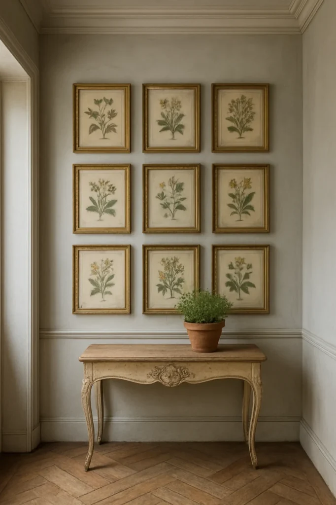 Vintage French botanical prints — those exquisite hand-coloured engravings of flowers, herbs, and plants produced by 18th and 19th century natural history publishers — are among the most versatile and enduringly beautiful decorative elements available to the French cottage decorator. Displayed in aged gilt or ebonised wooden frames, these prints bring a quality of scholarly beauty and historic refinement to any wall. A gallery arrangement of botanical prints creates a living, story-filled wall display that rewards close inspection and grows more beautiful the longer you live with it.