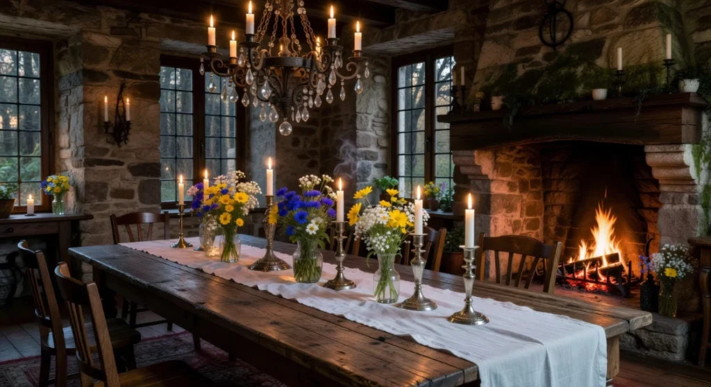 Silver candlesticks of varying heights grouped at the centre of the table, supplemented by tea lights in vintage glass holders along the length, create a layered candlelit atmosphere that is both practical and deeply romantic. The flickering light animates the stone walls, plays across the crystal drops of the chandelier, and turns the white linen tablecloth into a luminous landscape of shadows and highlights. This is the kind of dining room experience that guests remember long after the meal has ended. Candlelit French cottage dining room photography is among the most emotionally resonant and most-saved interior imagery on Pinterest’s romantic home and entertaining boards.