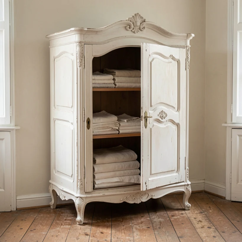 The distressed painting technique is key — a base coat of cream or off-white with a second coat in pale grey or stone, lightly sanded at the edges to reveal the layers beneath, creates exactly the kind of gently aged finish that defines French cottage style. Brass keyhole escutcheons and original hinges should be preserved wherever possible. Inside, neatly folded linen stacks, lavender sachets, and a few favourite books turn the armoire into a domestic still life. A painted French armoire photographed against an aged oak floor is among the most-saved antique furniture images on Pinterest worldwide.
