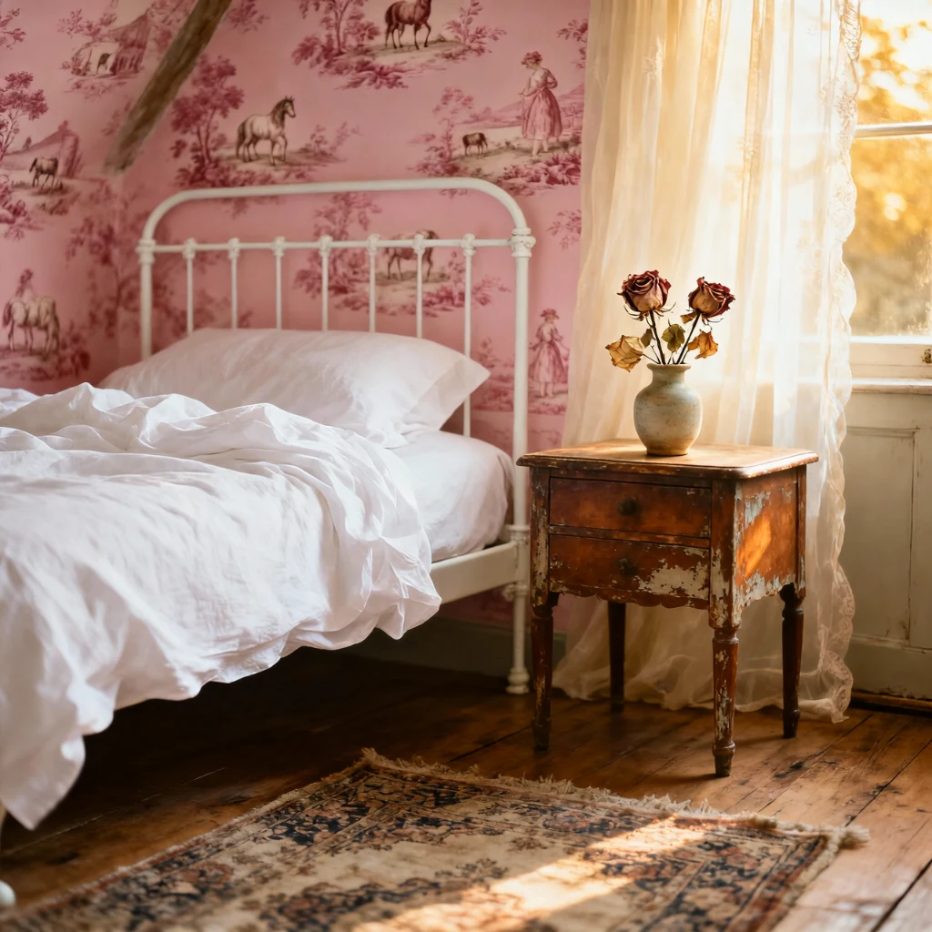 The beauty of toile de Jouy lies in its narrative quality — look closely and you will find shepherdesses, picnicking couples, flowering trees, and grazing animals woven into the repeat pattern. This storytelling dimension gives toile-decorated rooms a layered, literary quality that feels deeply French. Use toile on a single feature wall rather than all four to maintain lightness and prevent the pattern from becoming overwhelming. A white iron bed, white linen bedding, and simple wooden furniture allow the toile to star without competition. Toile de Jouy interiors are perennially popular on Pinterest’s French country and romantic bedroom boards.