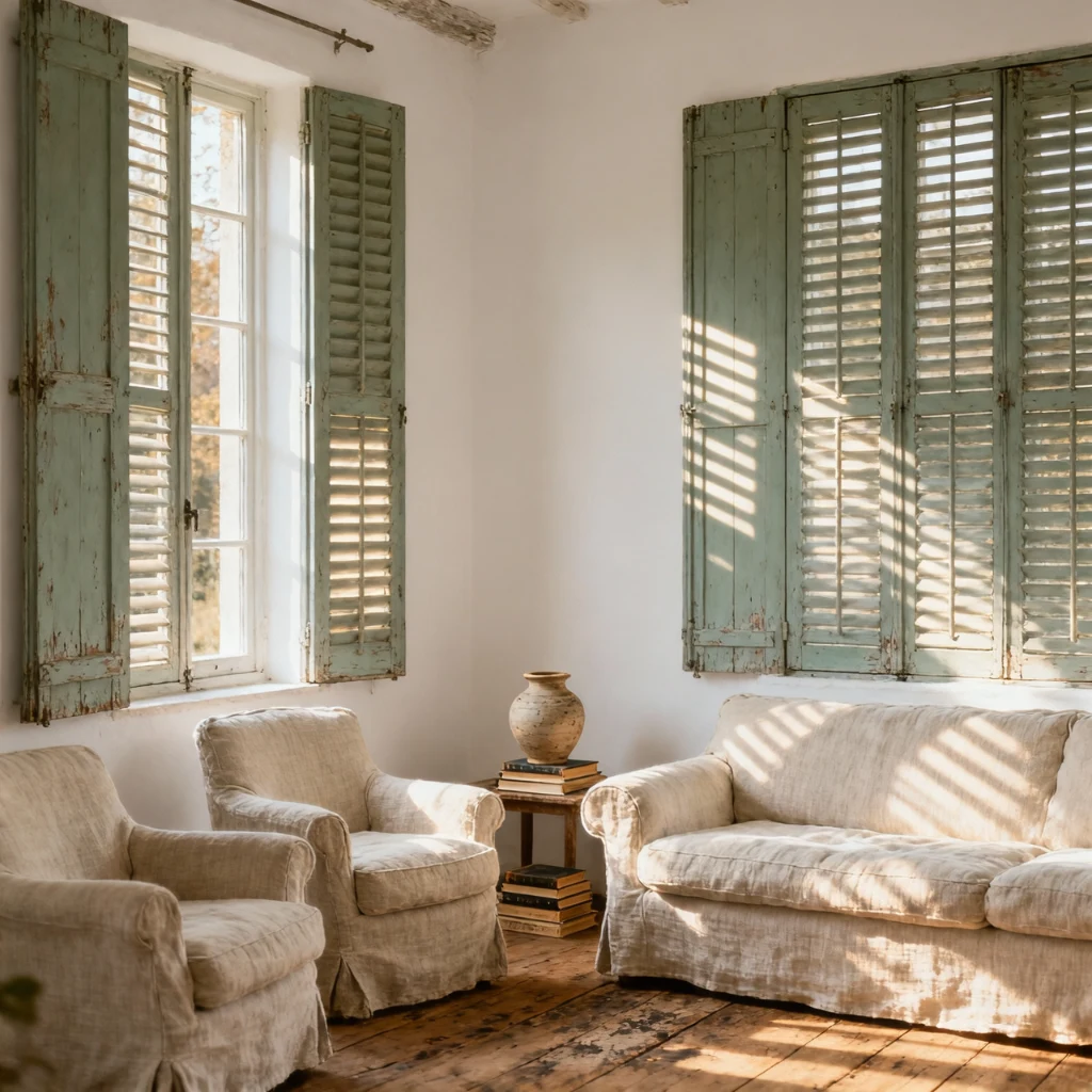 Interior wooden shutters are one of the most characteristically French window treatments and one of the most effective ways of introducing authentic French cottage character into any room. Full-height painted timber shutters in soft aged grey-green, pale duck egg blue, or chalky off-white fold back against the window reveal to let in maximum light during the day and close at night to create an enveloping sense of warmth and privacy. When partially closed, the louvred slats cast beautiful striped patterns of light across the floor and walls.