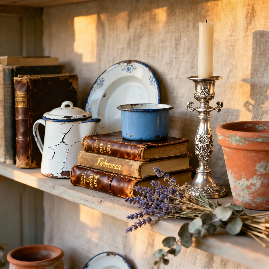 The French have an unparalleled tradition of the brocante — the antique flea market — and French cottage decor draws heavily on this culture of finding beauty in aged, imperfect, and discarded objects. A shelf or mantelpiece curated with genuine antique market finds has a quality of authenticity and personality that no amount of new furniture can replicate. Vintage French enamelware in cream and navy, aged terracotta pots, tarnished silver candlesticks, old leather-bound books, and worn copper pots all contribute to a story of time and place.