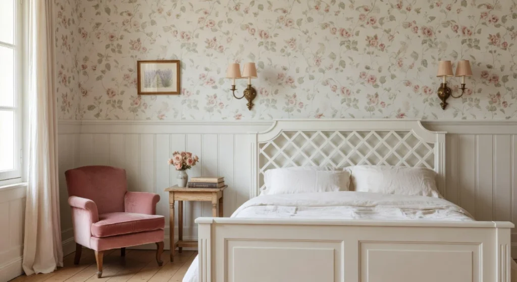 Half-height wooden panelling — painted in pale grey or off-white — below the floral wallpaper creates an elegant division of the wall that references classic French interior architecture. Antique brass wall lights with fabric shades add a warm, amber glow that brings out the warmth of the rose and cream tones in the wallpaper above. White linen bedding keeps the bedroom feeling fresh and light against the pattern-covered walls. Soft muted floral wallpaper bedrooms are consistently among the most-admired and most-saved French country bedroom ideas on Pinterest’s romantic interior design boards.
