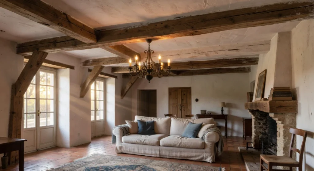Original rough-hewn oak ceiling beams are among the most architecturally precious features of genuine French farmhouse and cottage buildings, and in any French cottage-inspired interior, exposed beams are an essential element. Whether left in their natural dark oak colour or painted white to blend softly with the ceiling plaster, ceiling beams add a structural drama and sense of age that completely transforms the character of a room. They lower the perceived ceiling height in a way that feels intimate and sheltering rather than cramped.