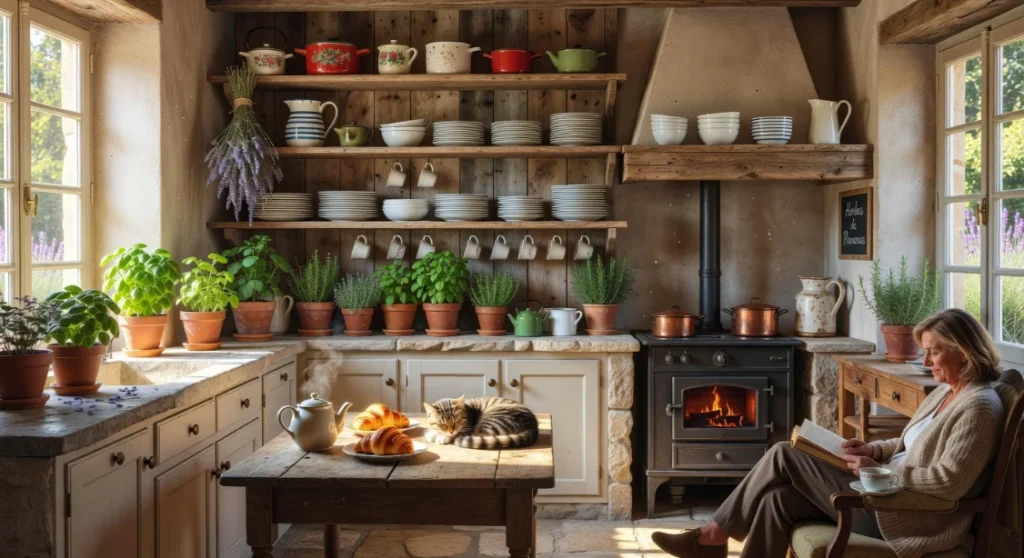 A French country kitchen is built around the pleasure of cooking and the beauty of everyday objects on display. Open wooden shelving — painted cream or left in natural aged oak — replaces the upper cabinetry of the conventional fitted kitchen, allowing the kitchen’s collection of white ceramic dishes, vintage enamelware, copper pots, glass jars of dried pulses, and fresh herb pots to be displayed as decorative elements in their own right. In a French cottage kitchen, storage is never hidden — it is curated and celebrated.