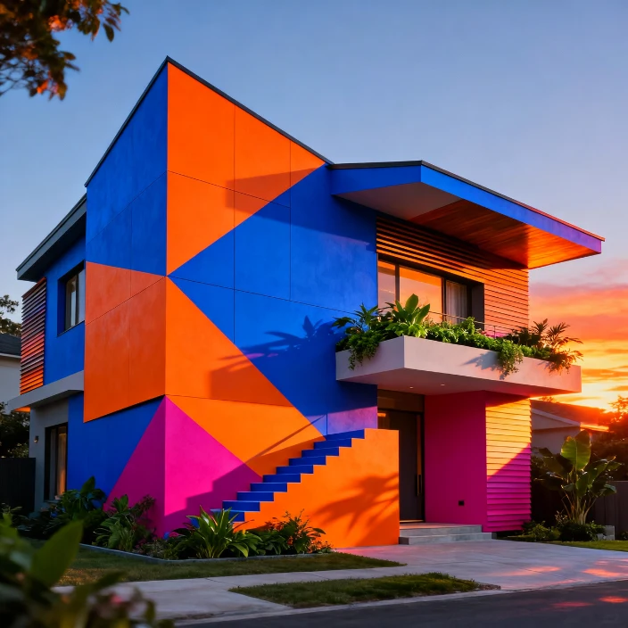 Maximalist exterior design embraces fearless use of color, and color-block facades are the perfect starting point. Instead of subtle tones, different sections of the home are painted in bold, contrasting hues such as cobalt blue, terracotta, mustard, or emerald green. This creates a dynamic, artistic look that immediately grabs attention and expresses personality.