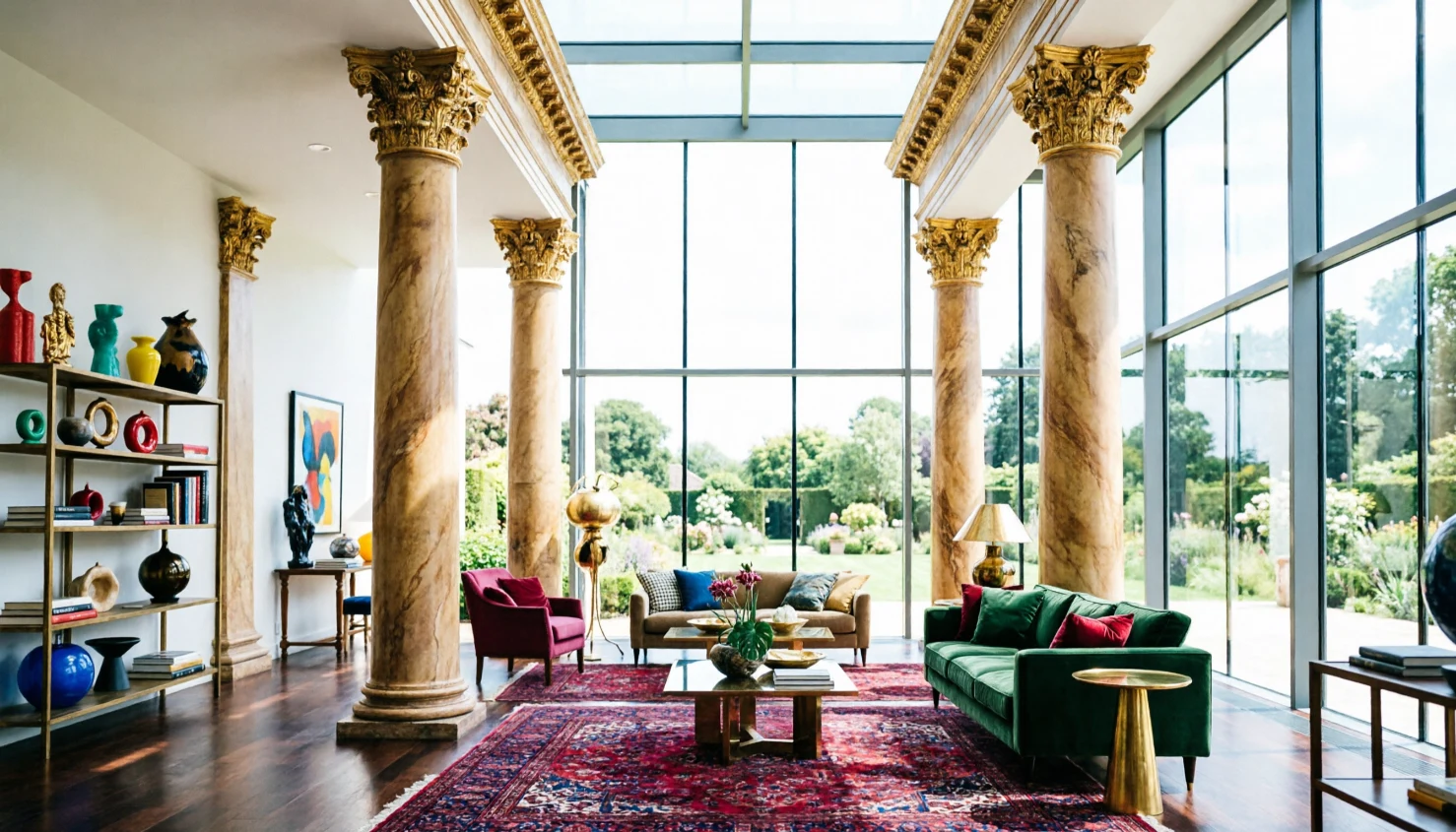 Maximalist design often blends multiple architectural eras. Classical columns, modern glass panels, and industrial elements can coexist in one structure. This fusion creates a layered, storytelling effect.