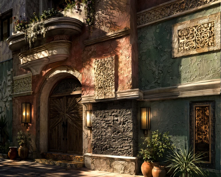 Textured walls add tactile richness to maximalist exteriors. From rough plaster to carved stone or layered concrete, surfaces become visually dynamic and expressive.