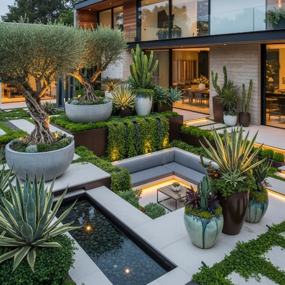 Maximalist landscaping is bold and expressive, featuring sculptural plants, oversized planters, and layered greenery. Instead of minimal garden design, this approach embraces abundance and artistic arrangement.