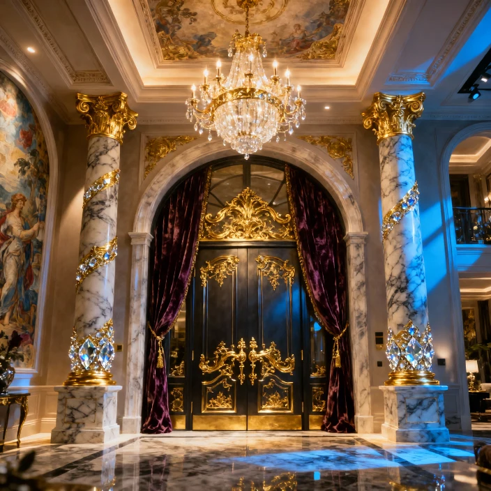 A grand entryway sets the tone for maximalist architecture. Oversized doors, bold colors, decorative columns, or sculptural framing create a powerful sense of arrival. The entrance becomes a statement rather than a simple passage.