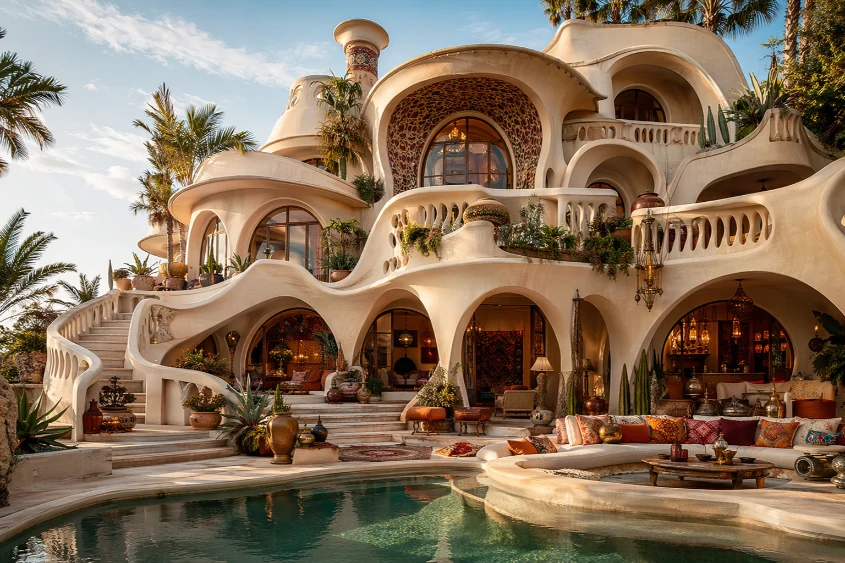Curved architecture softens the intensity of maximalist design while maintaining visual interest. Arches, rounded balconies, and flowing wall shapes introduce elegance and movement.