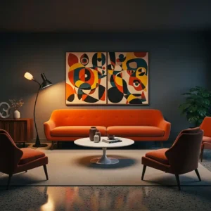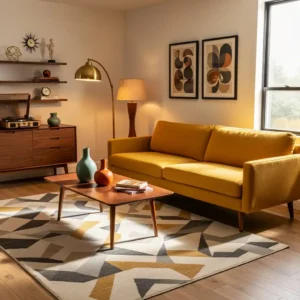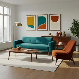 Keep surrounding elements simple so the colors stand out naturally. Incorporate wood finishes and brass accents to enhance the vintage vibe. The result is a dynamic yet harmonious space that reflects the bold creativity of mid century interiors.