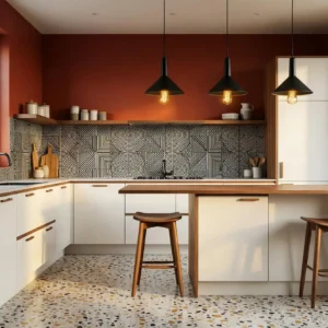 Add chrome fixtures and simple cabinetry to enhance the vintage feel. Keep decor minimal so the color combination remains the focal point. Designers often use this palette to create cheerful spaces with authentic retro character.