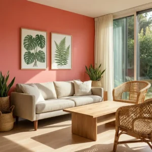 Coral adds playful brightness to mid century interiors while teak wood provides warmth and richness. The vibrant coral shade energizes the room without overwhelming the design.