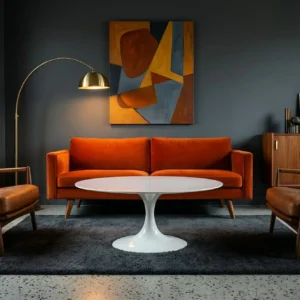 Earthy brown and orange reflect the natural influences of mid century design. The warm tones create a cozy and inviting environment perfect for relaxed living spaces.