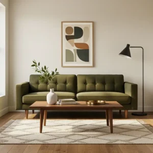 Olive green paired with cream creates a calm and earthy mid century palette. The muted green tone reflects nature while cream softens the overall look, preventing the space from feeling heavy. This combination works beautifully in both living rooms and bedrooms.