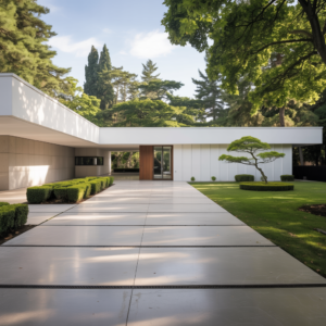 This exterior blends mid century roots with contemporary minimalism through a refined mix of concrete and wood. Smooth concrete surfaces create a clean, almost sculptural base, while horizontal wooden panels introduce warmth and natural texture. The flat roof enhances the sleek silhouette and reinforces the horizontal emphasis typical of the style.