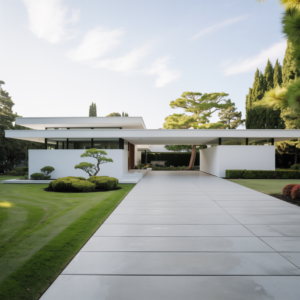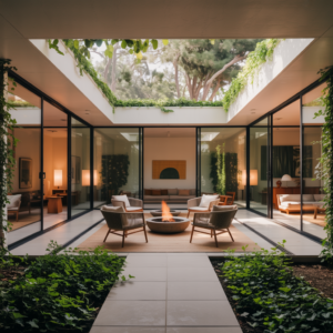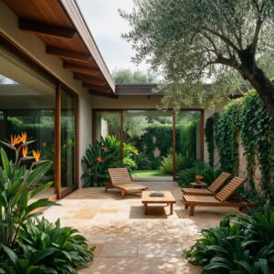 A courtyard-centered exterior emphasizes privacy and tranquility. Glass walls often face inward toward a landscaped patio, creating a seamless indoor-outdoor flow. From the street, the façade may appear modest, but inside, the home opens dramatically to a lush central garden.