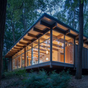 Exposed beams frame large glass panels, showcasing the craftsmanship while creating strong linear patterns across the façade. This approach emphasizes openness and harmony with the surrounding environment, especially when placed in wooded or natural settings.